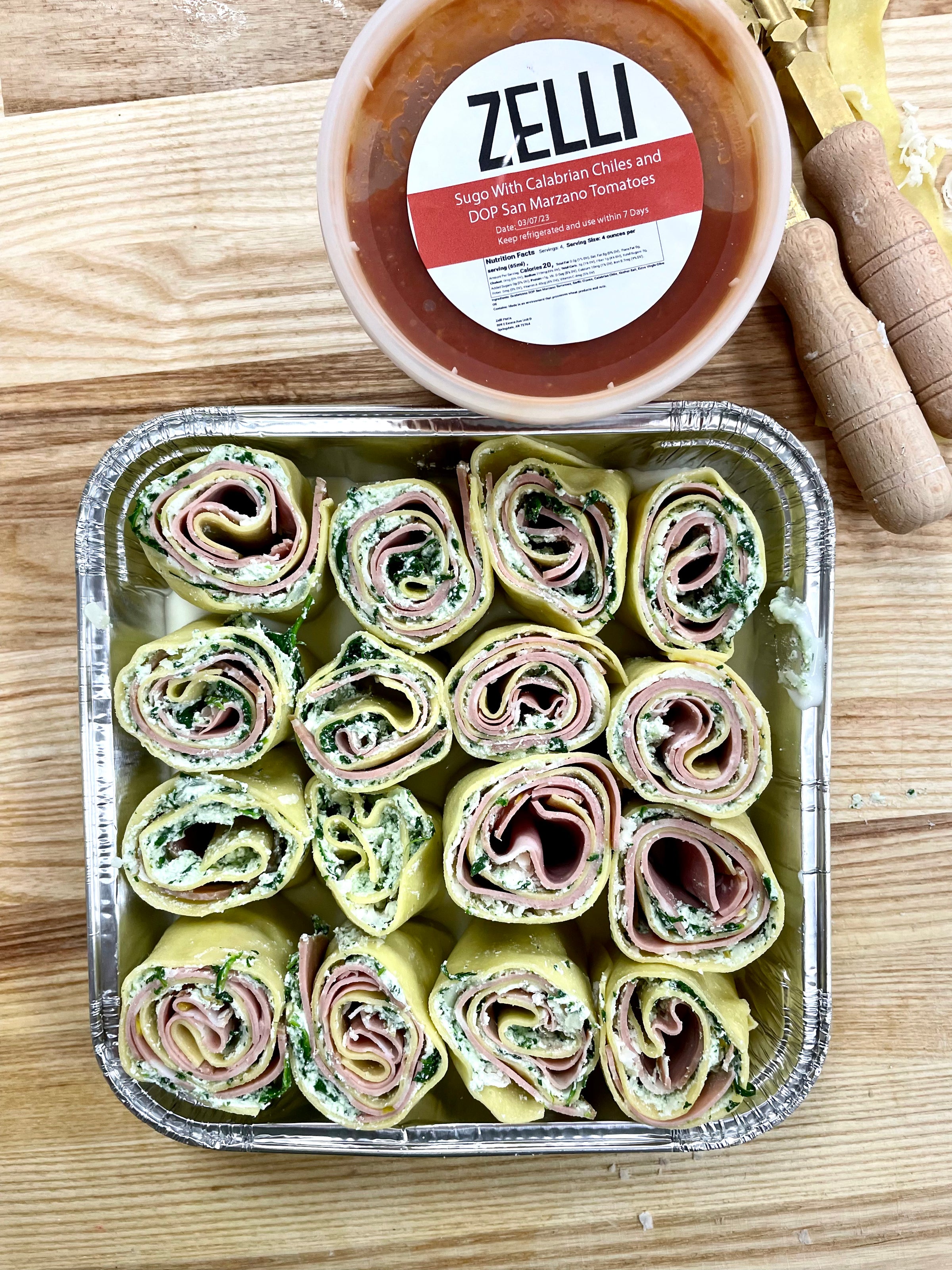 Lasagna Rollups: Take-n-bake -  is a prepared meal featuring delicious homemade Zelli pasta, mortadella (with pistachios) or thinly sliced zucchini, spinach/ricotta & grana padano cheese. The rolls are placed in our Zelli tomato sauce.  Simply bake in the oven and enjoy!