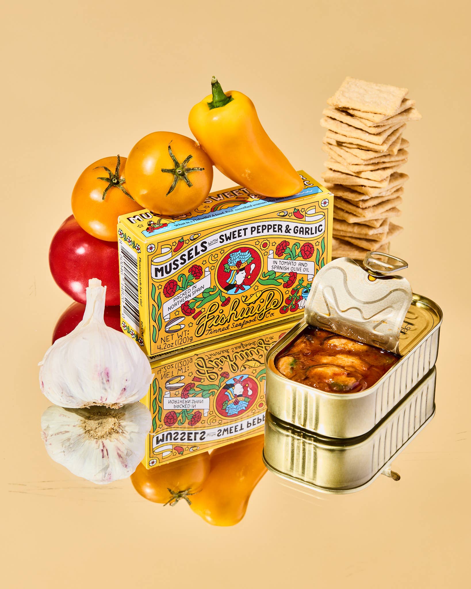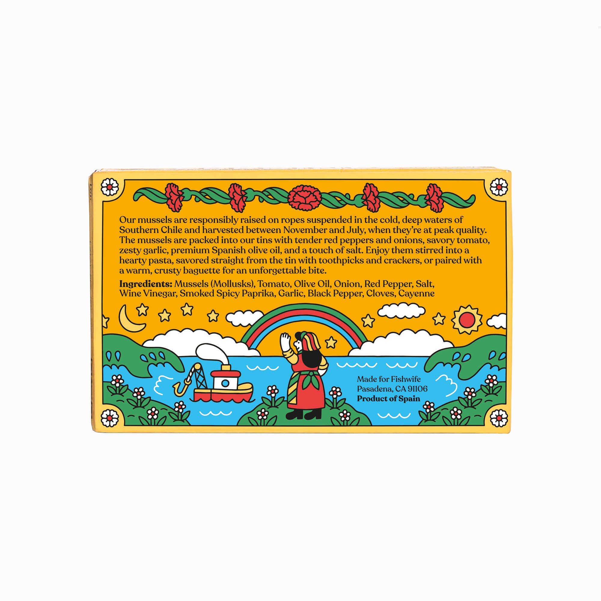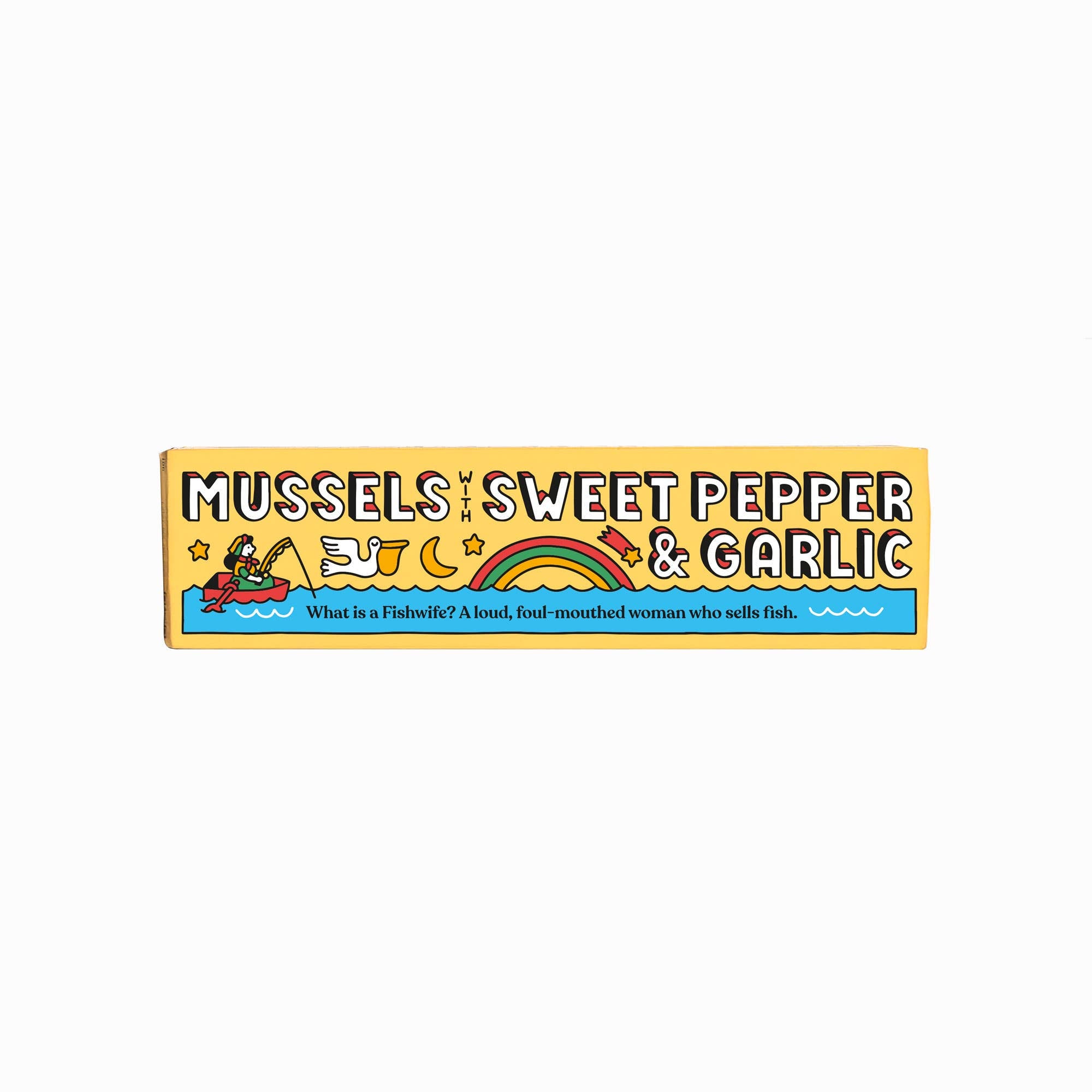 Mussels with Sweet Pepper and Garlic, thoughtfully sourced and artfully packed in partnership with heritage producers across Spain and Chile. These tins are a celebration of responsible aquaculture, artisanal canning traditions, and delicious, fresh, craveable flavor. Mussels in a tomato-based sauce with red pepper, garlic, smoked paprika, cayenne, and spices — bold, balanced, and the sidekick to any toasted baguette.